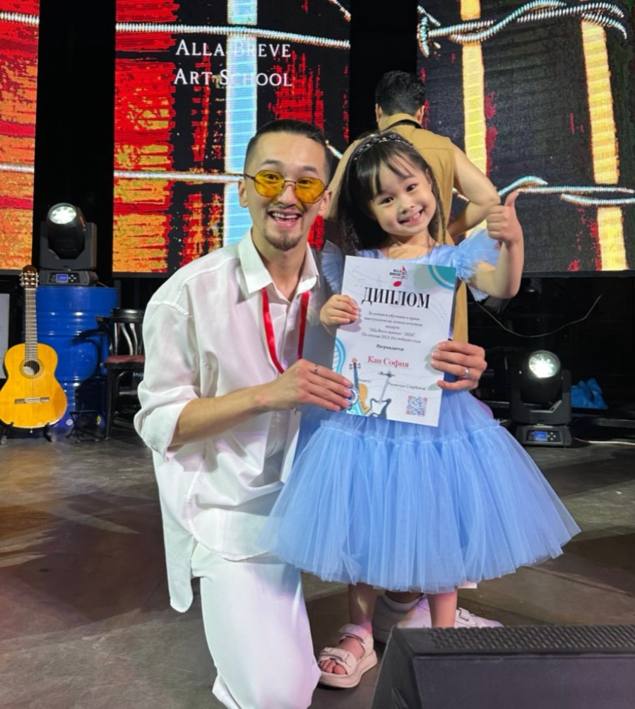 – Когда мне исполнилось четыре года, мама отдала меня в музыкальную школу Alla breve. Там я начала заниматься вокалом уже более серьезно и выступать на сцене. Моего педагога по вокалу зовут Рыскельди Старбеков. Он многому меня учит и всегда поддерживает.